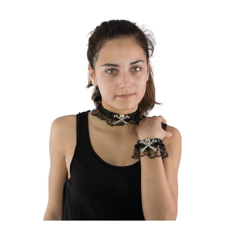Faites valoir votre style excentrique et décalé avec l'ensemble ras de cou et bracelet dentelle et squelette.