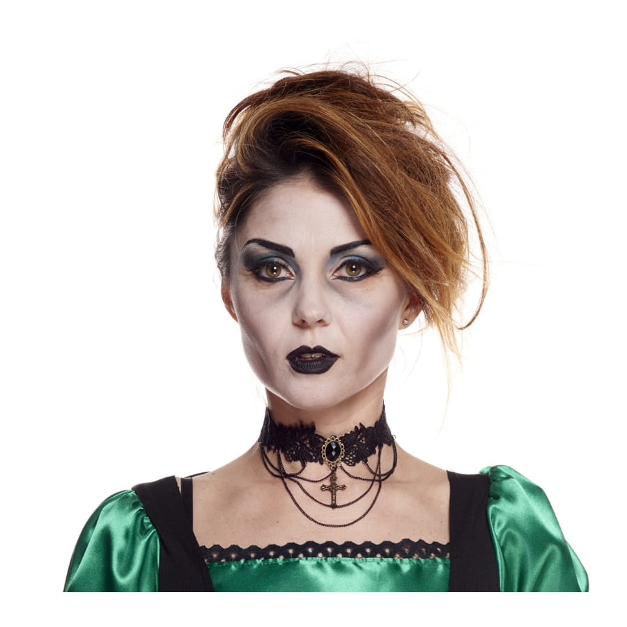 Un bijou peut faire toute la différence ! Emparez-vous de ce ras de cou noir avec croix, en dentelle. Cet accessoire de déguisement pour femme est formé d'un collier en dentelle, de couleur noire, agrémenté d'une croix qui pendouille au centre. Le bijou s'accorde avec le style gothique, et s'adapte parfaitement aux déguisements de sorcière ou de religieuse.