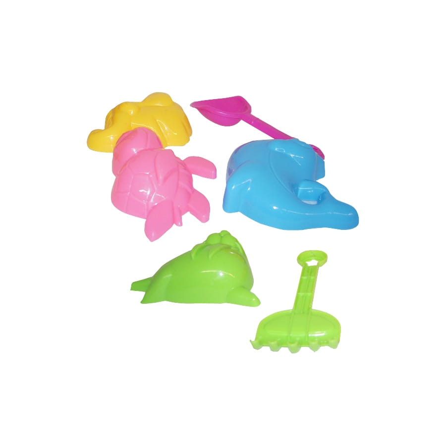 Accessoires de plage composé d'un rateau rose, d'une pelle verte et de moules de différentes formes et couleurs. Offrez ce kit à votre enfant et laissez-le s'amuser sur la plage ou dans le bac à sable.