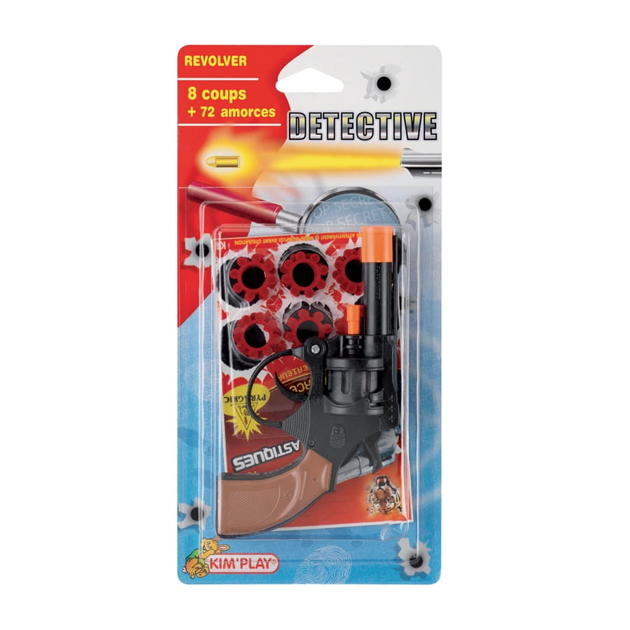 Vous vous sentirez comme un vrai détective, un vrai policier, un vrai shérif ou un vrai hors-la-loi avec ce révolver 8 coups avec pétards. Ce révolver est de couleur marron et noire, comme ceux que vous voyez souvent dans les films. Avec 8 coups et 72 amorces, vous aurez de quoi vous amuser, mais avant cela, enfilez votre déguisement.