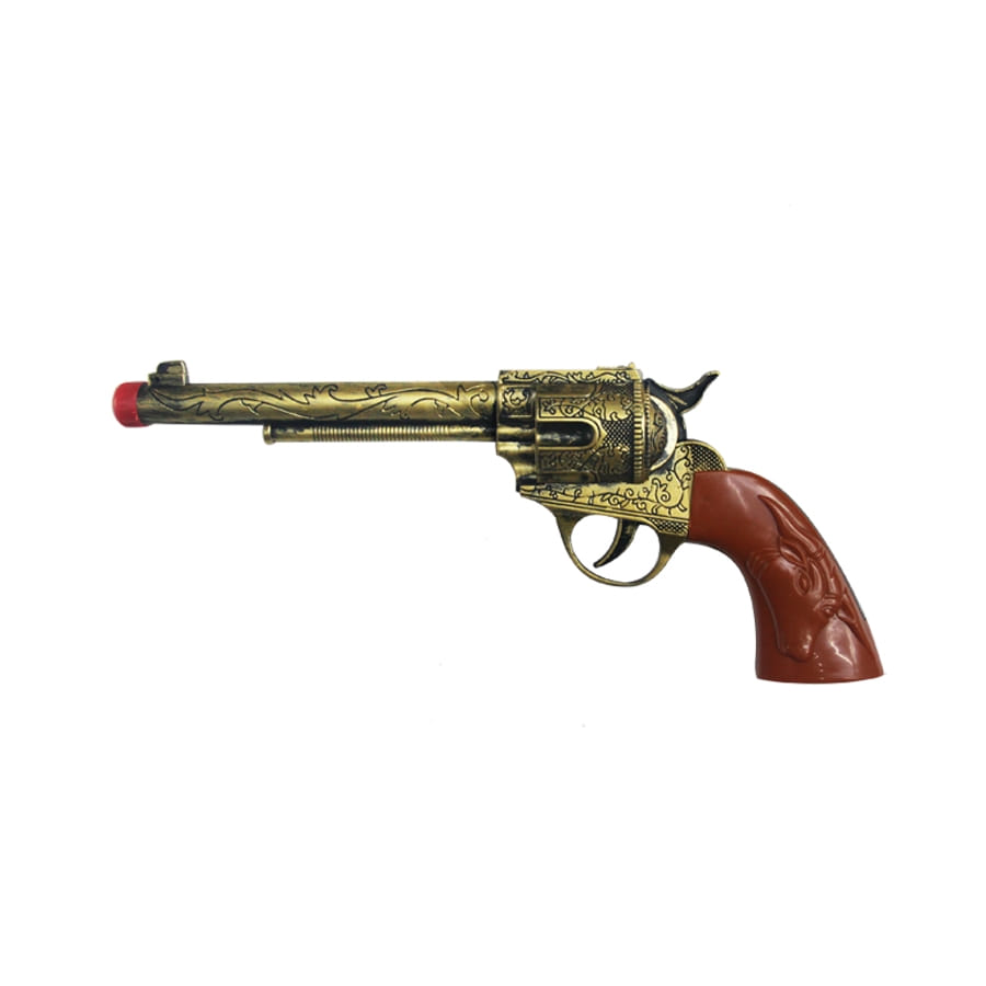 Jouez le rôle d'un cowboy ou incarnez le personnage de votre film western préféré grâce à ce Revolver de cowboy doré en plastique. Cet accessoire destiné à la gent masculine, petit ou grand, est constitué d'un revolver en plastique mesurant 31 cm de long. Cette arme est dotée d'un manche marron et d'un canon doré à motifs avec un bout rouge.
