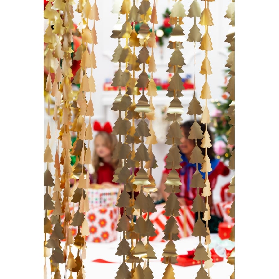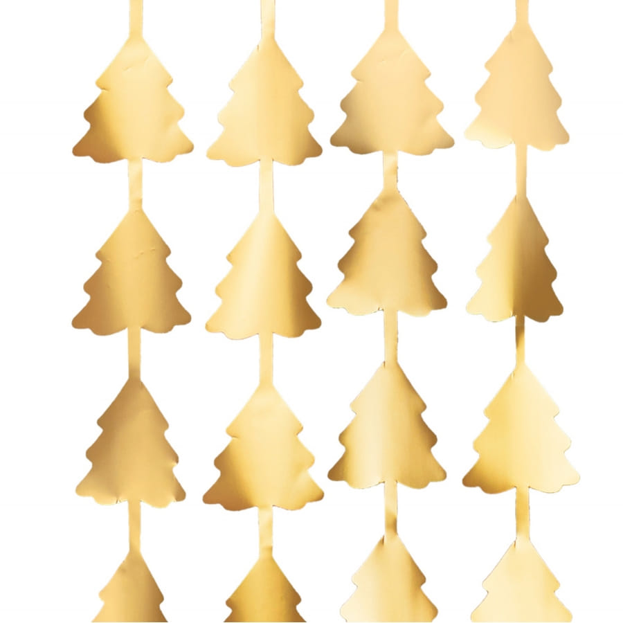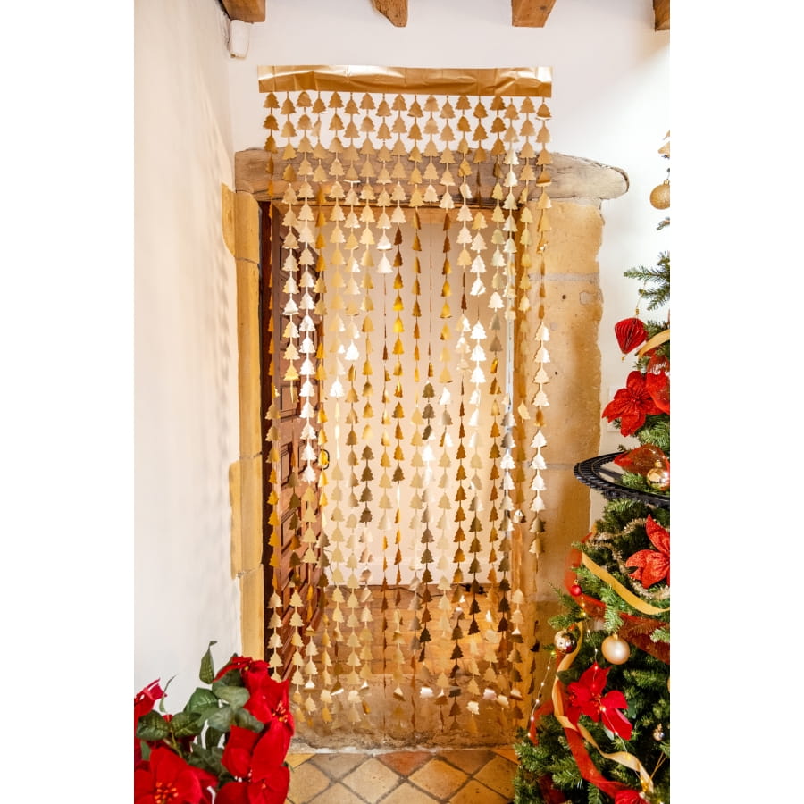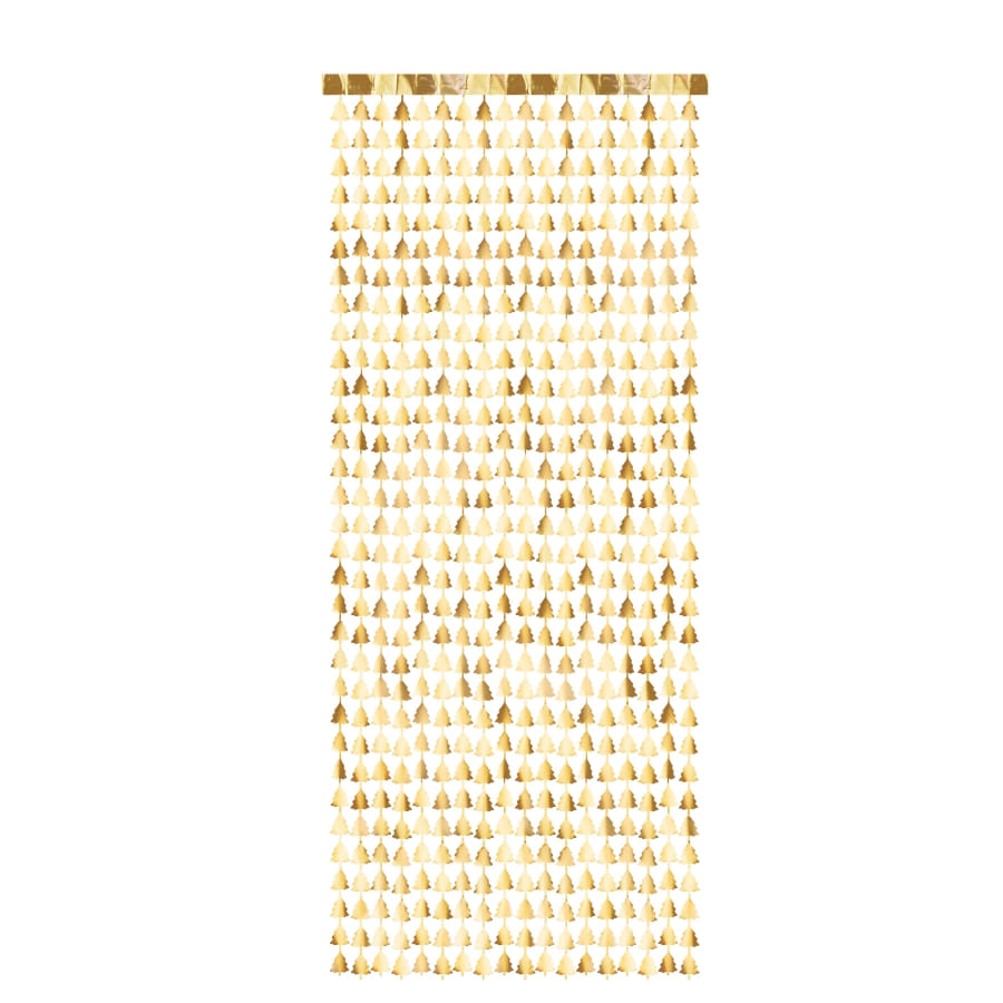 Plantez un décor de rêve pour une soirée tout feu tout flamme, avec le rideau de sapins dorés 100 x 245 cm.