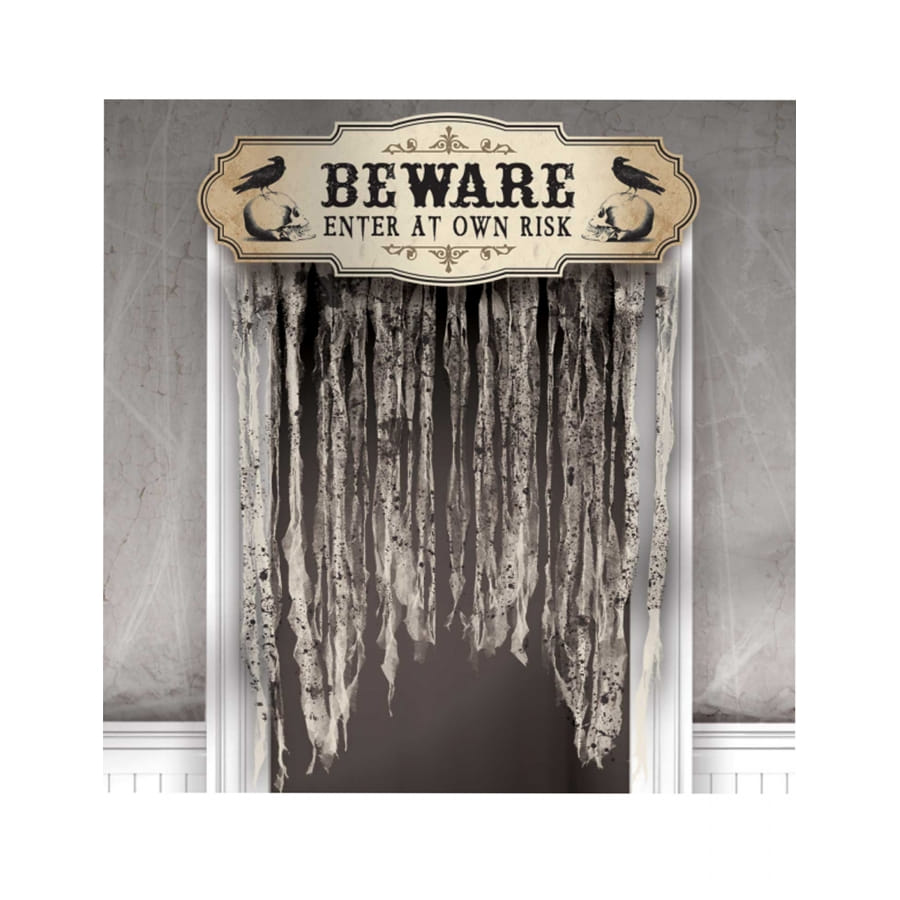 Votre maison deviendra un manoir hanté pendant la période d'Halloween avec ce rideau entrée de porte tête Halloween en lambeaux.