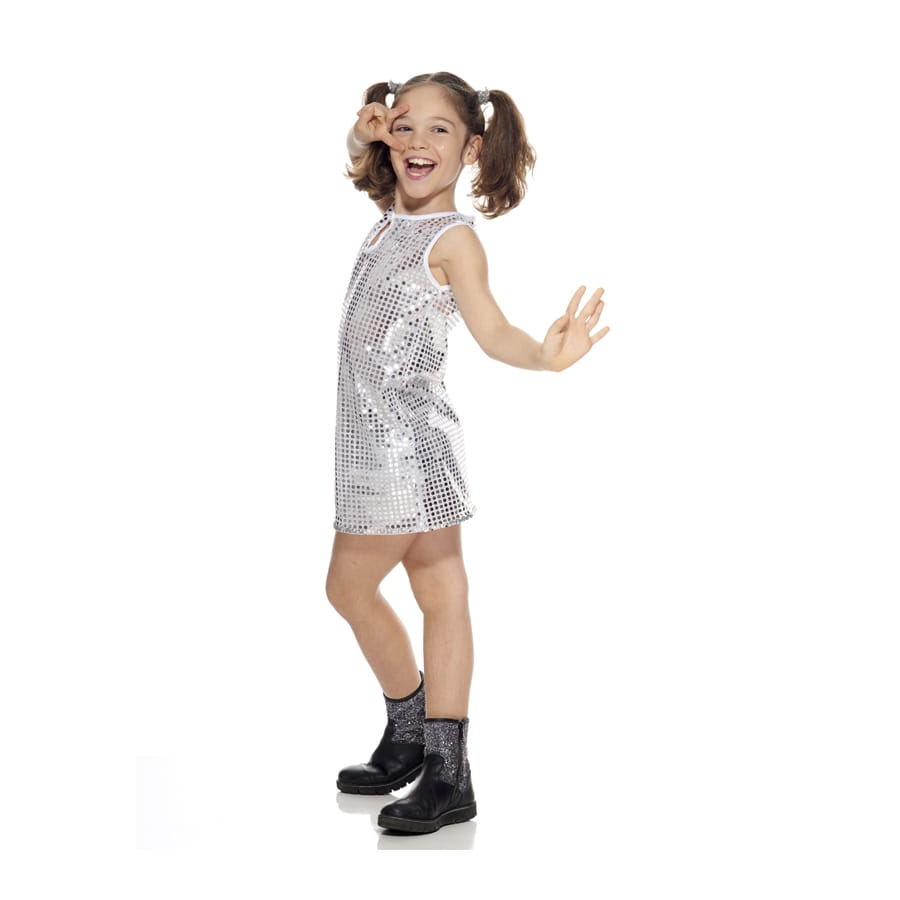 Une robe à paillettes sera idéale si elle incarne le personnage d'une danseuse, elle sera heureuse dans cette magnifique robe à paillettes. Elle pourra même le porter pour le carnaval ou une fête des années 70. Une robe à paillettes sans manches avec bordures blanches.