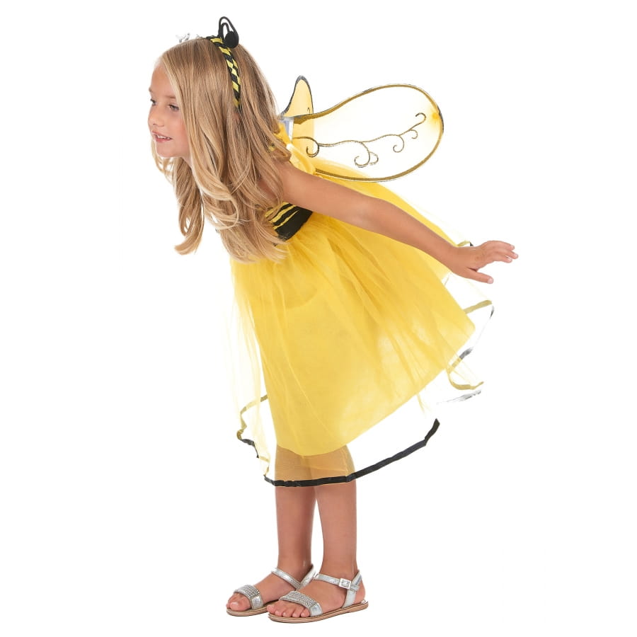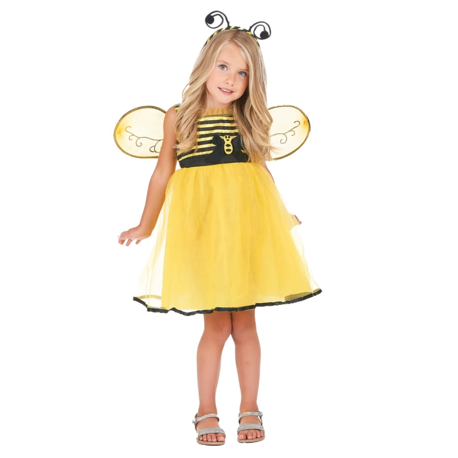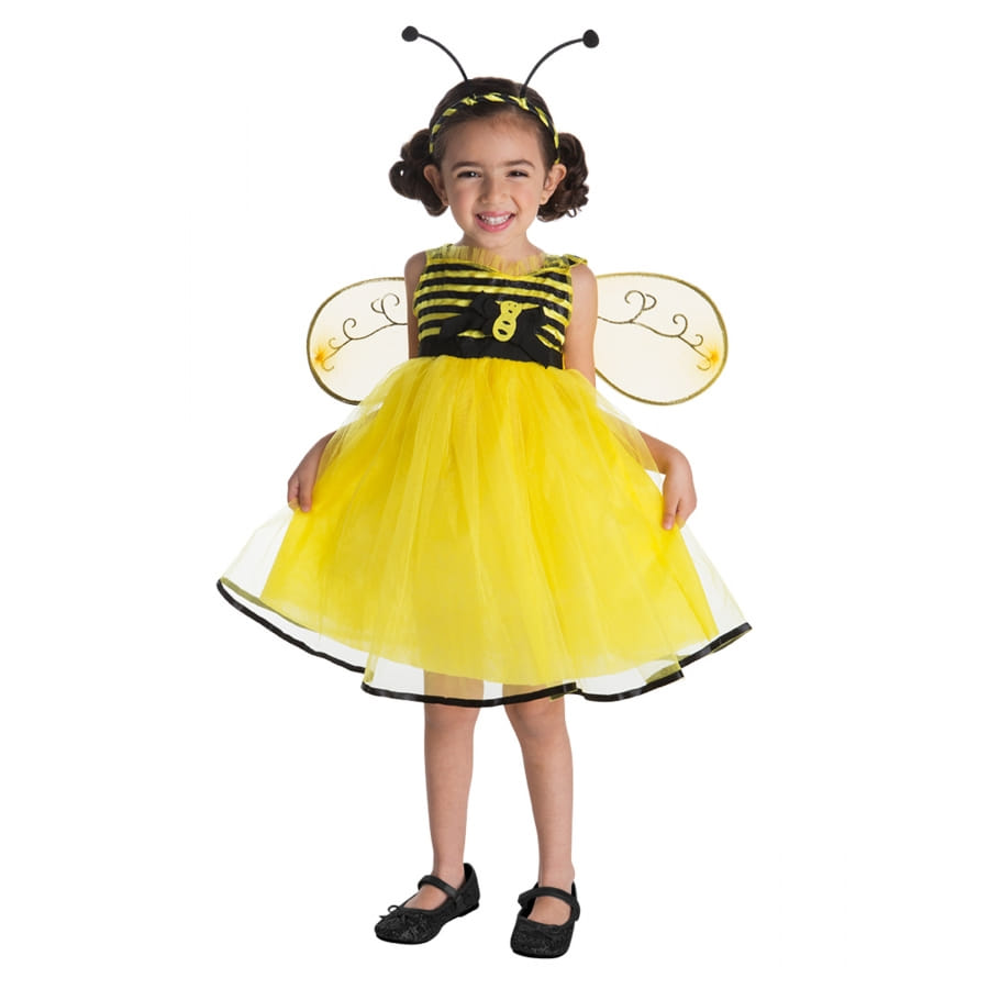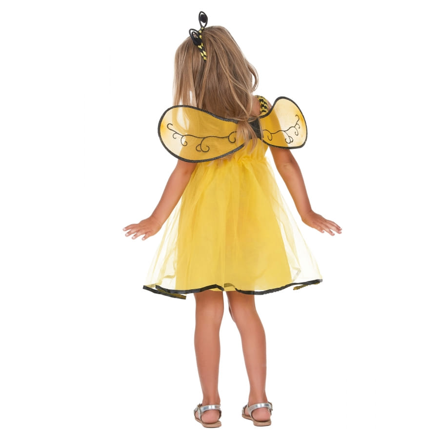 Cette Robe abeille pour enfant est jaune et agrémentée de rayures noires pailletées qui imitent bien le corps de l'insecte.