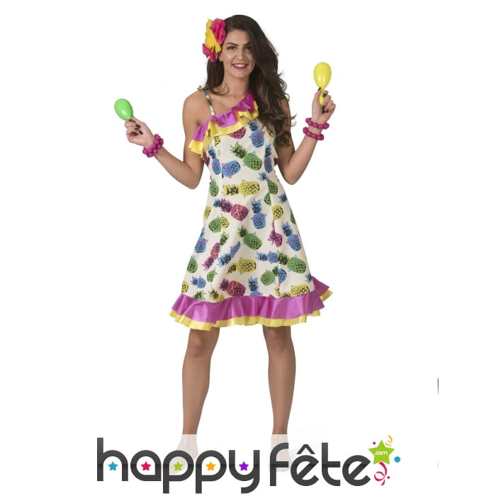 Craquez pour cette robe ananas multicolore pour adulte, et esquissez avec grâce quelques pas de hula, lors d'une soirée sur le thème des Antilles.