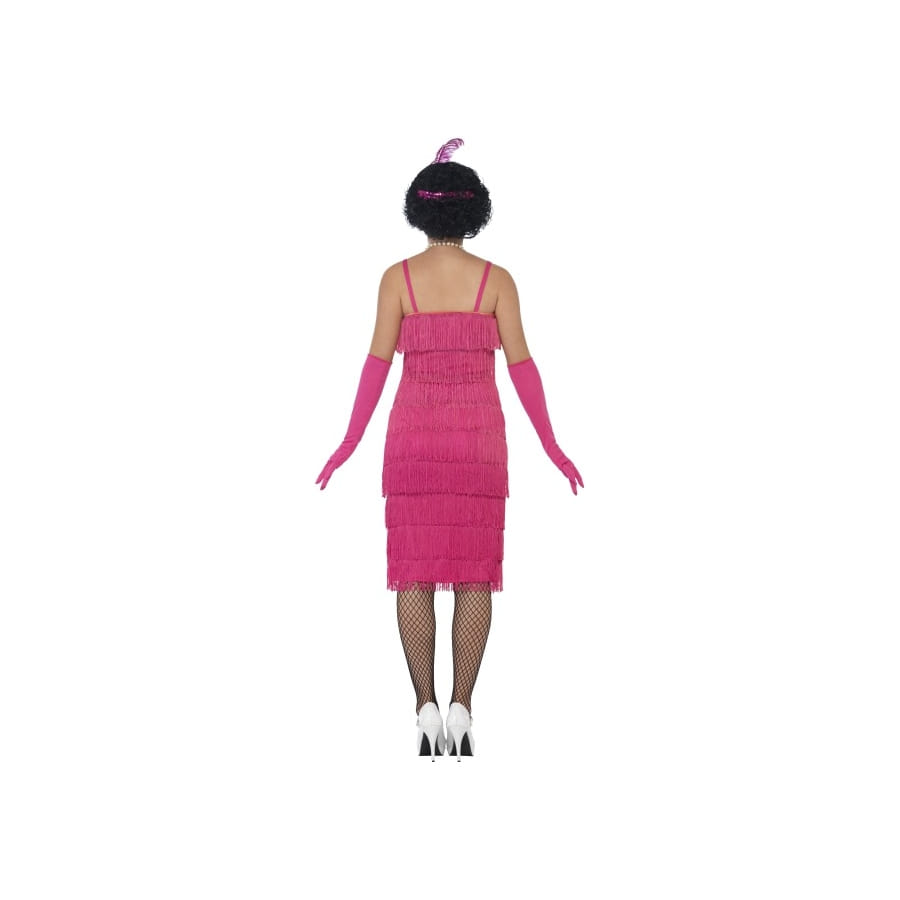 Devenez une flapper girl le temps d'une soirée ! Adopter un style peu conventionnel dans les années 20 n'était pas chose facile, mais le résultat en valait largement la peine. Jetez un oeil à cette robe années 20 à franges rose, flappers, et vous serez conquise. Il s'agit d'un modèle à franges de couleur rose fuchsia. Cette robe à bretelles descend jusqu'aux genoux. Le petit bandeau à plume est de couleur assortie, et se marie bien avec le style. Un effet ultra chic se dégage de la tenue grâce à la paire de gants rose fuchsia. Vous pourrez personnaliser cet ensemble à votre guise à l'aide des accessoires sur happyfete : des bijoux, des boas à plumes, des collants, etc.