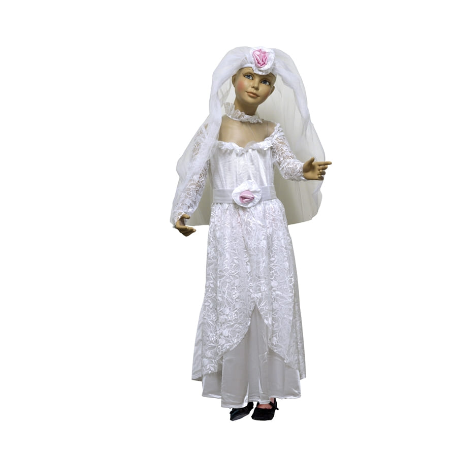 Dès leur plus jeune âge, les petites filles rêvent déjà de se retrouver dans les bras de leur futur prince charmant. Comme dans un conte de fée, permettez à votre jolie demoiselle de jouer à la mariée avec cette robe blanche de petite mariée. Elle sera adorable dans sa longue robe blanche légèrement décolletée. Les manches sont longues et recouvertes de motifs floraux blancs sur un fond semi-transparent. La taille est ornée d'une fausse fleur en tissu de couleur rose. Vous remarquerez une fine dentelle au niveau du col. Comme toutes les robes de mariée, celle-ci est accompagnée d'un léger voile blanc et transparent. Il s'agit d'un long voile sur lequel a été cousue une fleur en tissu rose, identique à celle fixée au niveau de la taille.