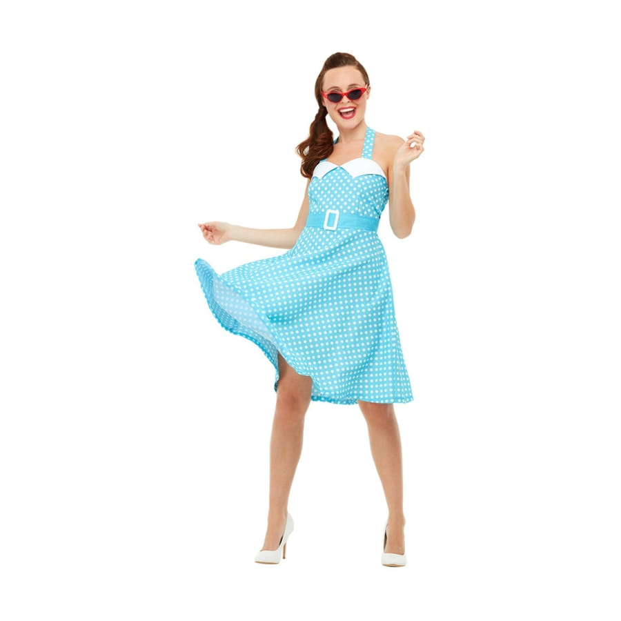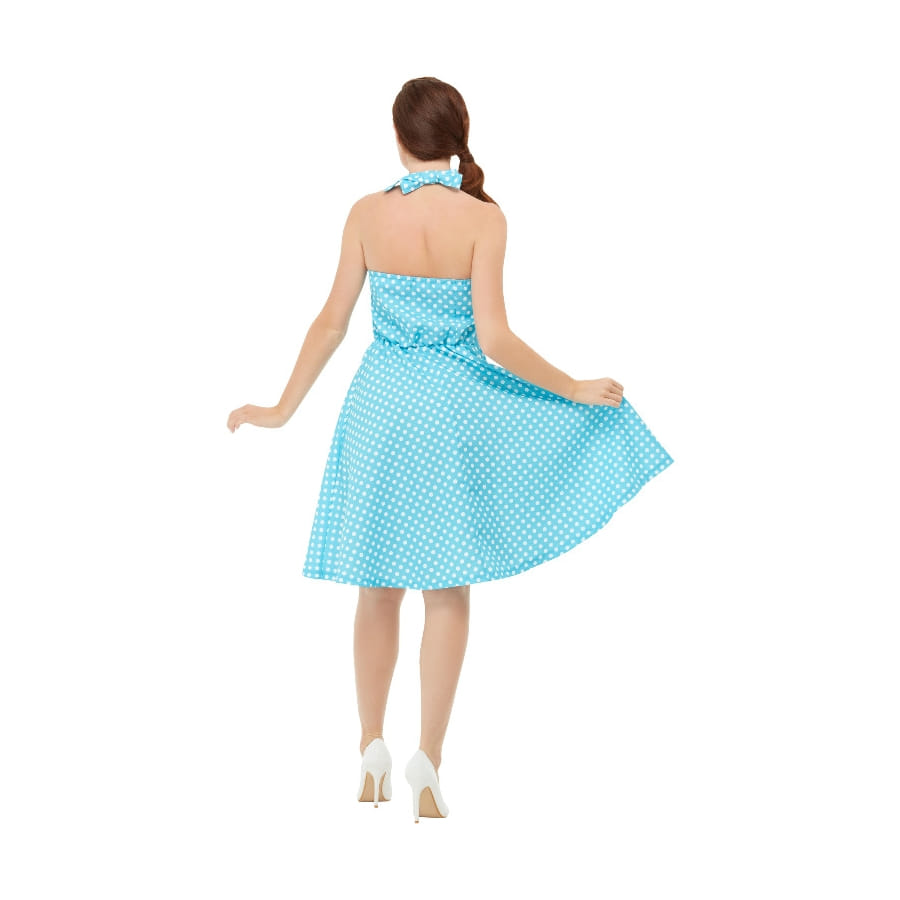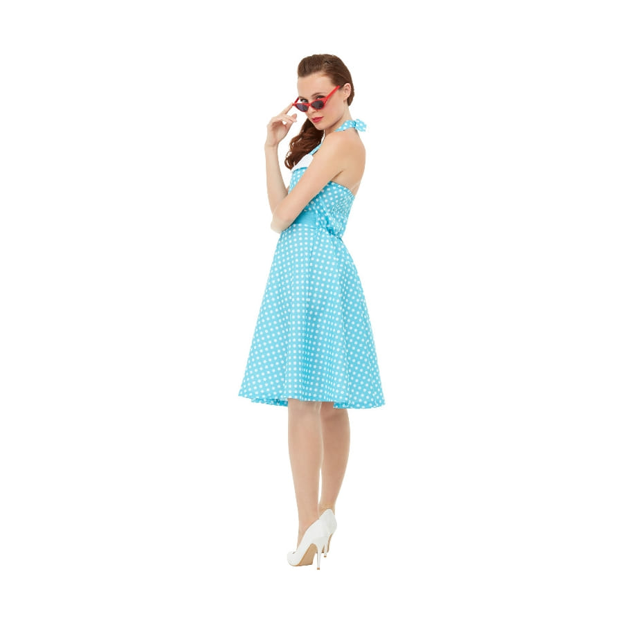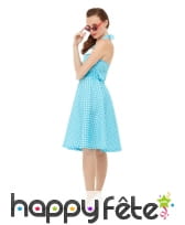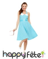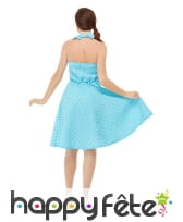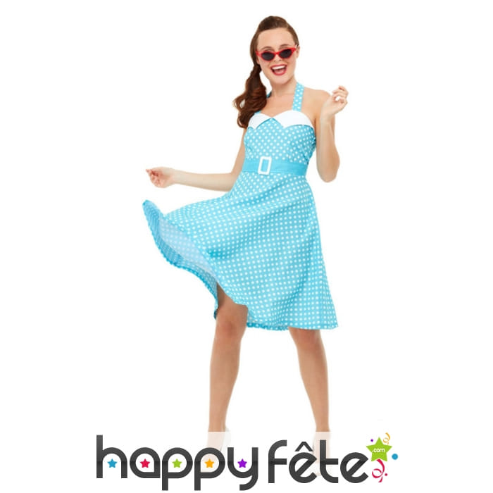 Pour une fête rétro, nous vous proposons cette Robe bleue à pois blancs de style années 50.