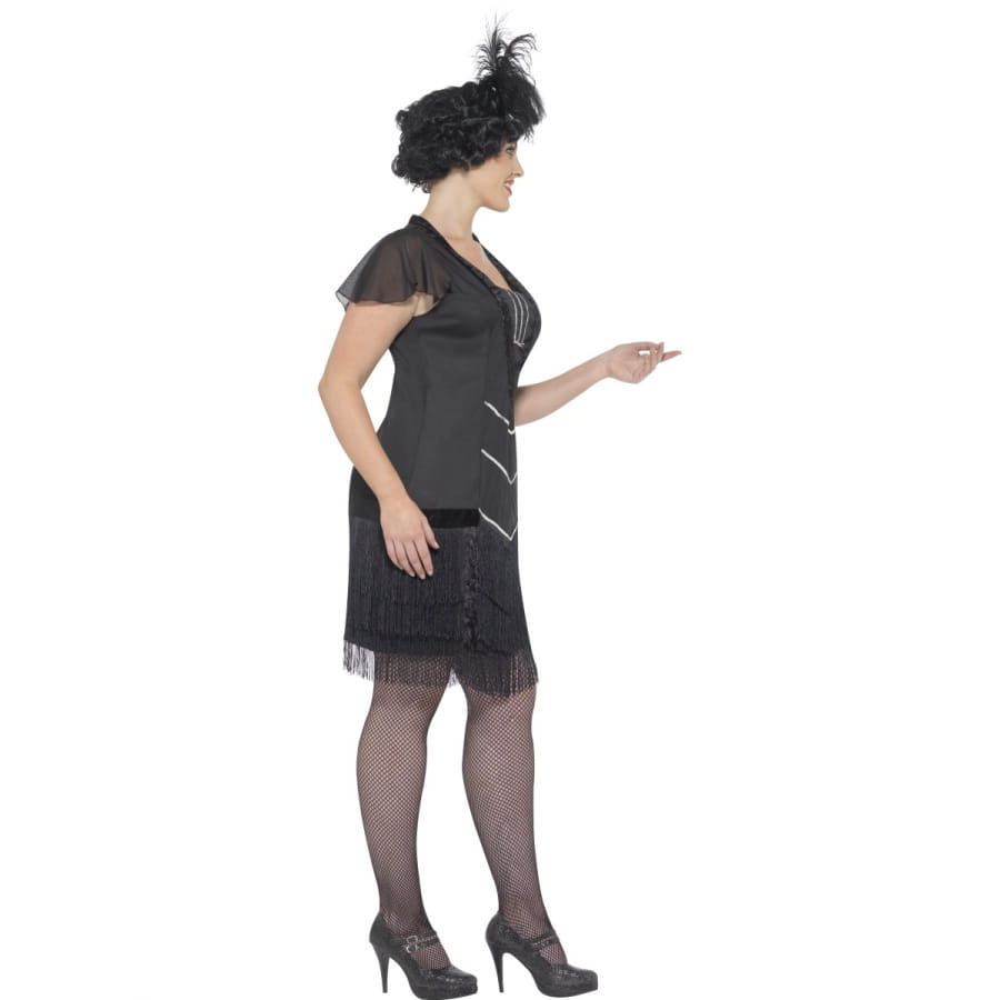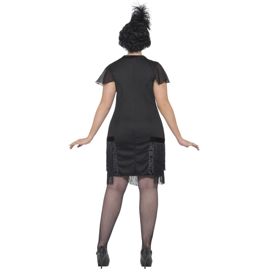 Si vous avez toujours rêvé d'être une danseuse, nous vous offrons ici l'occasion de mettre l'une des plus belles tenues qu'une danseuse puisse avoir : une robe cabaret noire à franges, grande taille, dédiée à celles qui veulent incarner une danseuse de cabaret des années 20. Cette robe nous fait revenir quelques années en arrière avec son style très particulier : courte et décolletée, épousant votre silhouette à merveille même si vous avez quelques formes généreuses, entièrement de couleur noire avec quelques traits blancs au milieu,des manches en voile et enfin des franges qui ornent tout le bas de la robe. Un bandeau noir orné de plumes noires pour les cheveux vient accessoiriser le tout.
