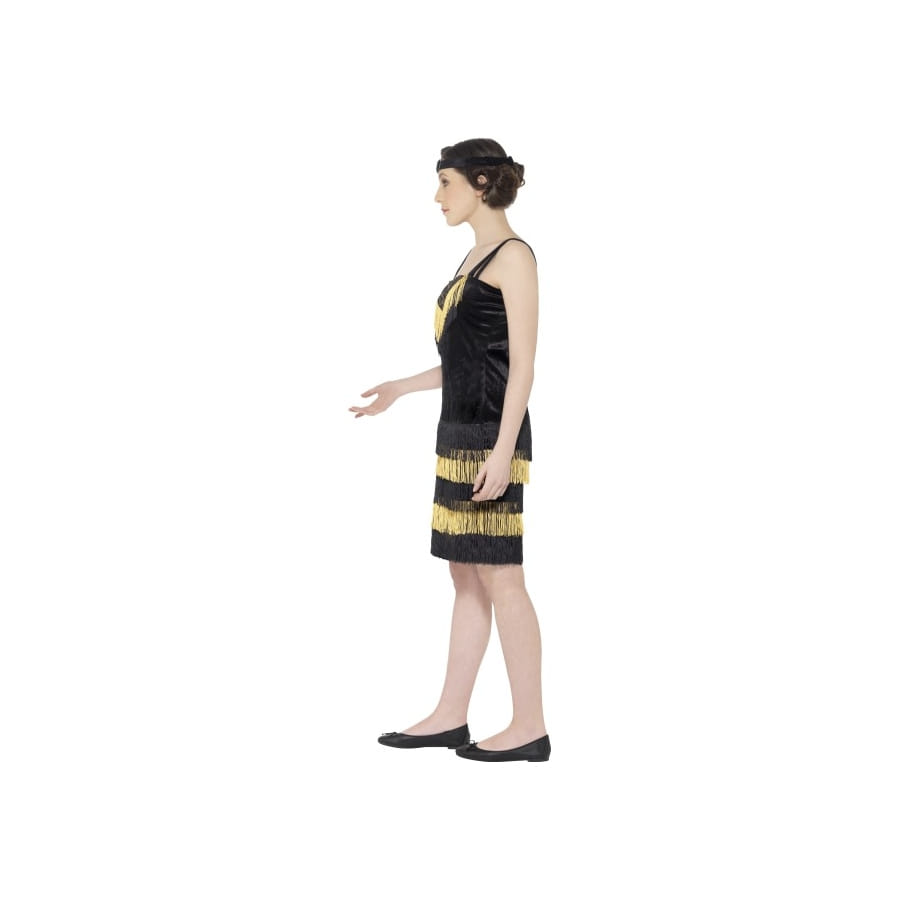Choisissez d'abord l'époque que vous souhaitez incarner Mesdemoiselles. Si vous dites années 20 et 30, cette robe charleston franges dorées pour adolescente est faite pour vous. De plus, on n'en voit tellement plus des comme ça ! Cette robe est droite, de couleur noire et arrivera juste au-dessus du genou. Toute la partie inférieure de la robe est ornée de franges noires et dorées, de même que la partie supérieure au niveau de la poitrine. Elle va très bien avec le bandeau qui l'accompagne, de couleur noire ornée d'une pierre noire sur le devant. Rajoutez un boa pour bien asseoir le personnage.