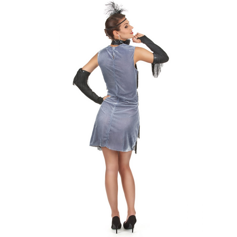Une véritable pretty woman s'avance sur la piste de danse. Elle dégage du style, du chic et du raffinement en tout point. Devenez la nouvelle reine du dancefloor dans cette robe charleston noire et grise avec franges. Elle est accompagnée de divers petits accessoires qui vous rendront sublime ! Il s'agit d'une robe de couleur grise dont le haut est pailleté jusqu'aux hanches. Des franges de couleur noire ont été disposées sur le devant de la robe. Une paire de manches de couleur noire, de 58 cm de long chacune, et agrémentée de franges noires viendra habiller majestueusement vos bras. Le tour de cou est également noir et orné d'une fleur en tissu. Le style année 20 est particulièrement mis en avant à travers le bandeau noir à plume. Vous aurez tout simplement affaire à la parfaite dose d'élégance !
