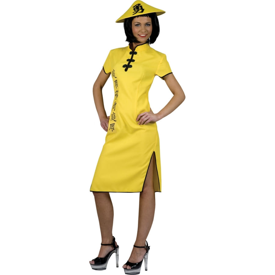Osez la différence et le chic grâce à cette Robe chinoise jaune unie avec inscriptions noires.