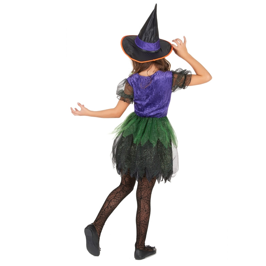 Cet ensemble est constitué d'une robe multicolore en polyester ainsi qu'un d'un chapeau pointu de petite sorcière.