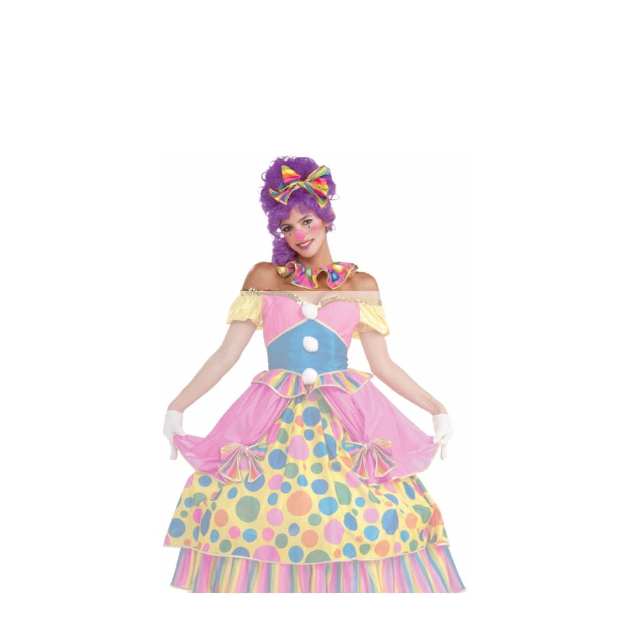 Qui vous a dit qu'une femme qui se déguise en clown doit avoir une dégaine pas terrible et rigolote comme les clowns masculins ? Vous vous trompez, la preuve, nous avons cette très jolie robe courte de clownette qui siéra à toutes les femmes. Elle comprend un noeud papillon multicolore ainsi qu'un body violet, auquel une ceinture à bretelles et un tutu multicolores sont attachés. Uniquement pour femme, cette robe est idéale pour une fête à thème cirque, humour ou n'importe quelle fête déguisée où vous voulez apparaitre déguisée en une magnifique clownette. Vous pouvez rajouter quelques accessoires comme un petit chapeau, le nez du clown, et choisissez bien les chaussures à mettre avec cette robe multicolore.