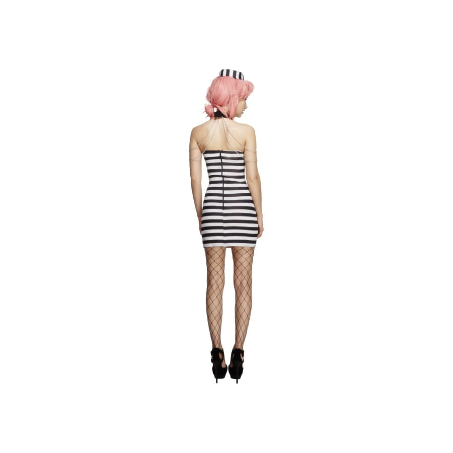Ce n'est pas parce que l'on se déguise en prisonnière que l'on ne peut pas être stylée et sexy. Nous voulons justement prouver cela en proposant ce costume de prisonnière sexy. Ce déguisement met en avant une robe moulante munie de rayures de couleur noire et blanche et parée de chaines grises qui décorent parfaitement la robe. Avec la robe, il y a aussi la coiffe de prisonnière, avec également des rayures de couleur noire et blanche. L, M et S : ce sont les tailles que nous avons en stock pour ce déguisement. Néanmoins, il doit être mis avec des chaussures à talons pour beaucoup plus vous mettre en valeur.
