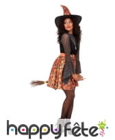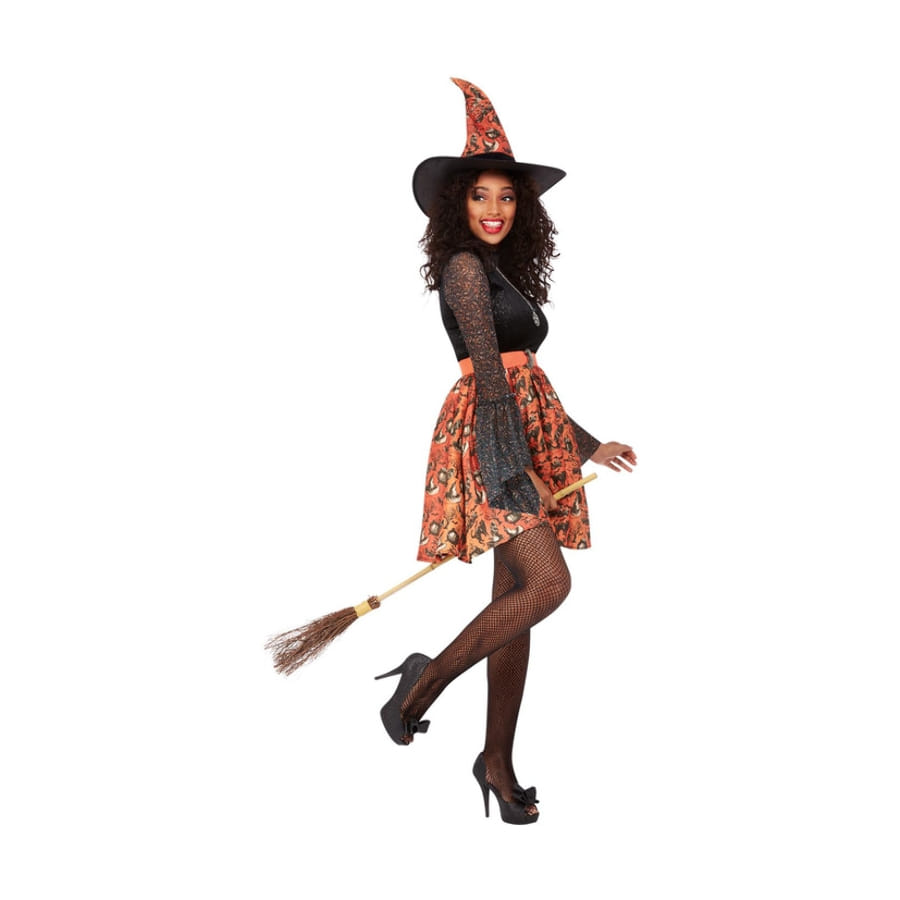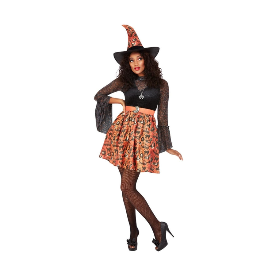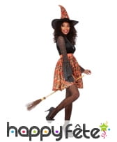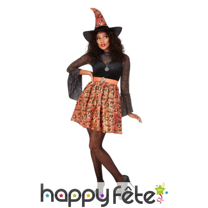 Du style, de la classe, mais aussi de la magie et de la sorcellerie, dans notre robe courte de sorcière noir et orange pour femme.