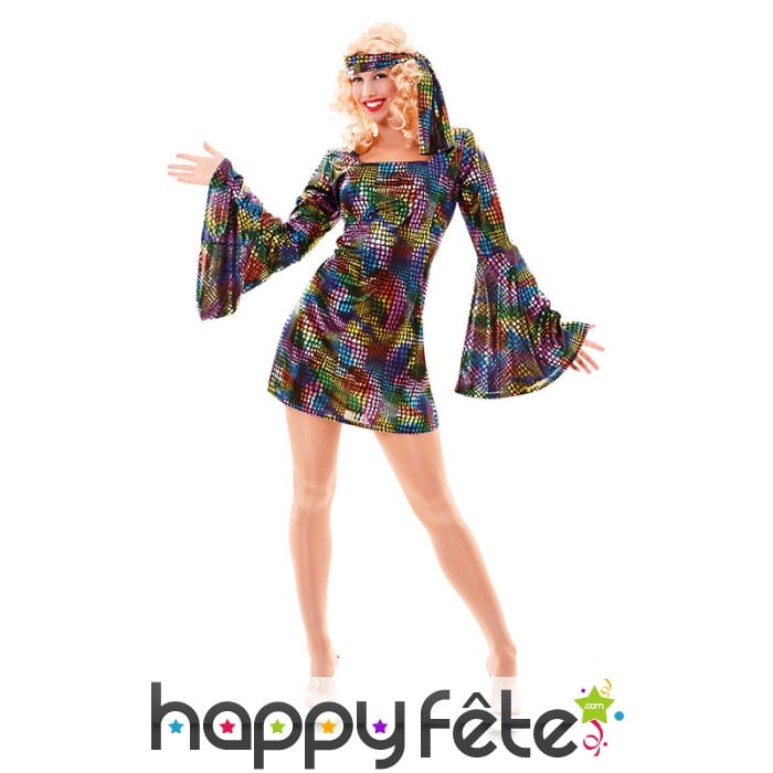 Faites une entrée remarquée pour votre prochaine soirée rétro avec cette superbe robe courte disco à longues manches évasées.