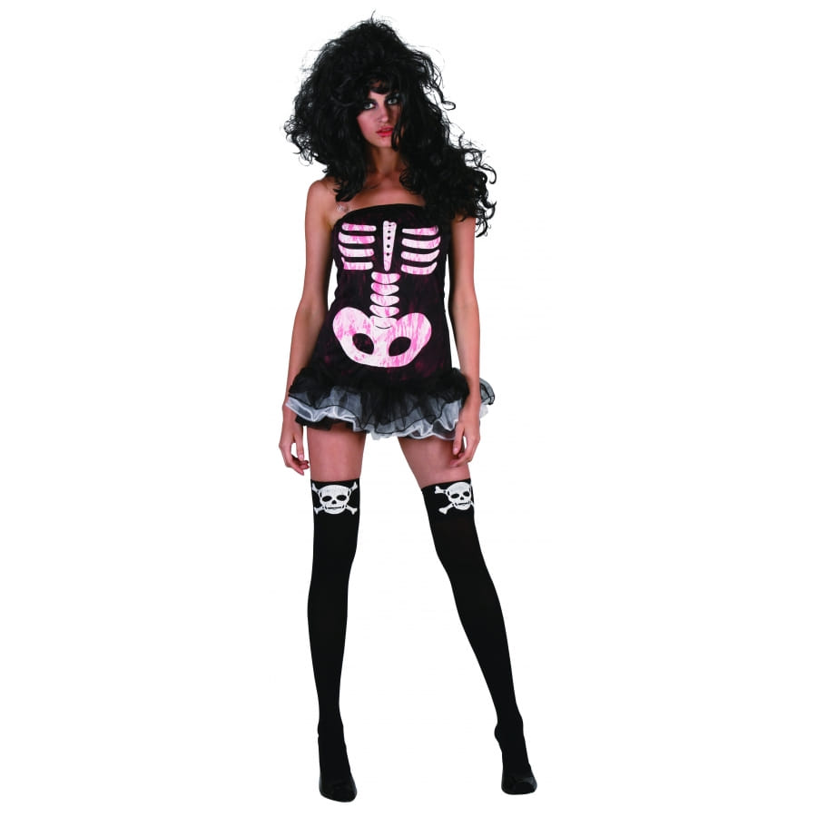 Envie d'être belle et sexy pour la fête des morts ou pour vos soirées avec déguisement? Cette robe courte sexy de squelette ensanglantée vous ira à merveille ! Une petite robe noire assez courte avec plusieurs volants en tulle sur le bas reste disponible sur notre site. C'est une robe bustier noire près du corps avec des bretelles transparentes intégrées. Elle présente un motif de squelette blanc avec une touche de rouge comme du sang sur le devant. Les volants en tulle permettent à la tenue d'avoir un joli volume sur le bas de la robe et d'ajouter une petite touche spéciale. Ce déguisement fera de vous la plus jolie des squelettes le temps de la fête des morts !