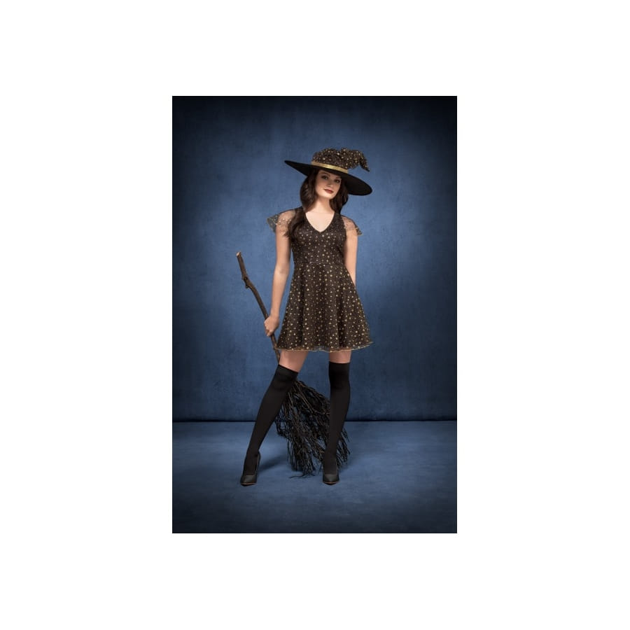 Halloween n'est pas faite uniquement pour faire peur. Mesdames, il s'agit également d'une occasion pour plaire en faisant appel à votre charme et à votre créativité ! Pour ce faire, happyfete peut vous aider grâce à la robe courte sorcière de la lune sexy que nous proposons sur notre site de vente en ligne. Dans cette petite robe noire à motifs dorés, à manches courtes avec jupe patineuse, vous ferez sans aucun doute sensation durant la fête des morts. L'ensemble comprend également un chapeau de sorcière noir avec une calotte froissée. Il est bordé à sa base d'un petit ruban doré. Voilà un déguisement qui en jette pour halloween !