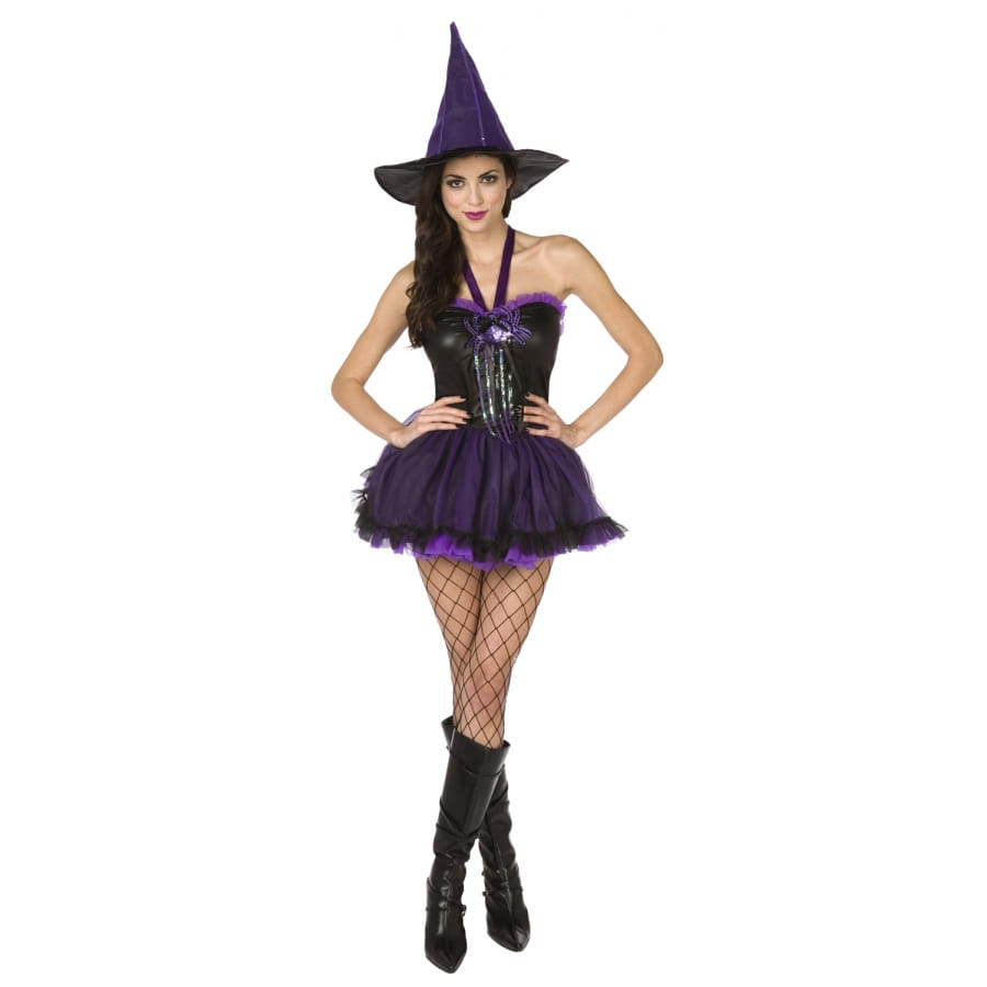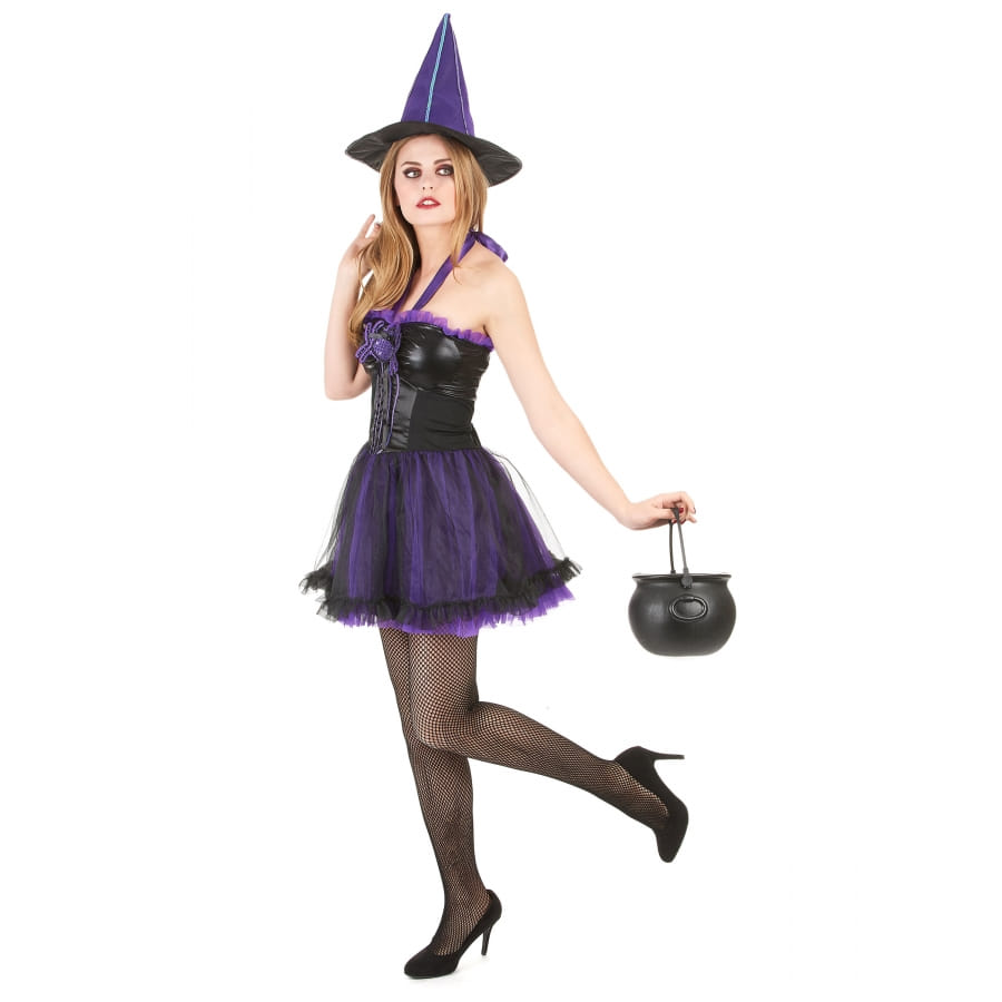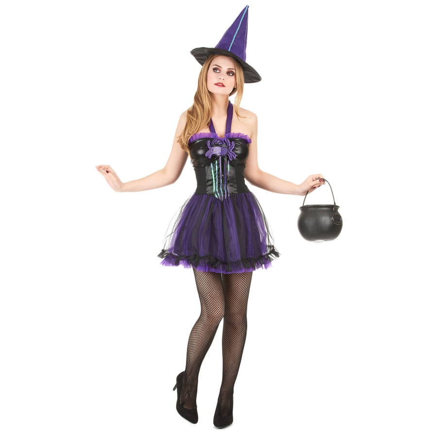 La sorcière est un personnage incontournable d'halloween et beaucoup désireront se déguiser ainsi. Soyez toutefois la plus sexy d'entre elles lors de la soirée de la fête des morts avec cette robe courte violette de sorcière avec tulle. En effet, nous vous proposons cette tenue sur notre site. Le déguisement comprend une robe bustier violette très courte recouverte par une voile en tulle noire. Au niveau de la poitrine se trouve une araignée violette brillante. Deux brettelles s'enroulant autour du cou facilite le maintien de la robe. Par ailleurs, un chapeau de sorcière à longue calotte pointue, de couleur violette vient compléter la robe pour faire de vous la plus sexy des sorcières de la fête d'halloween.