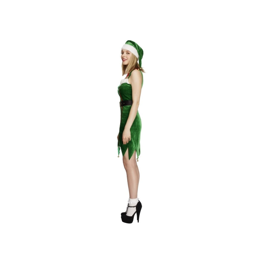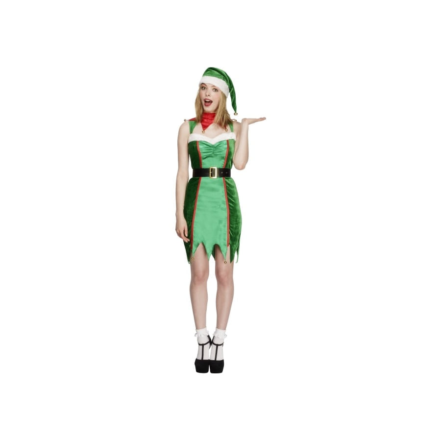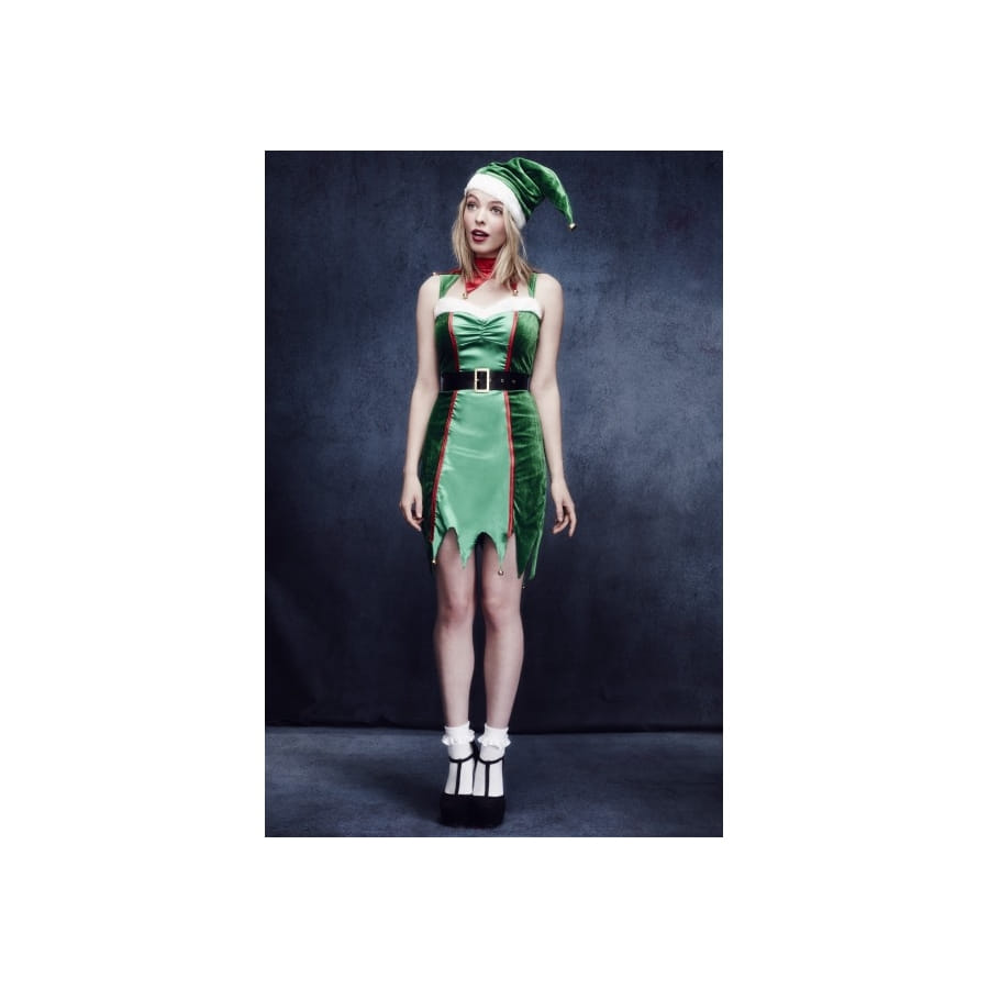 Nous nous déguisons tout le temps en Mère Noël, mais nous oublions qu'un joli déguisement sexy d'elfe comme celui-ci peut également nous mettre en valeur. Celui-ci est composé d'une robe moulante de couleur verte en deux nuances, plus foncée sur les deux côtés et plus claire au milieu, la bordure au niveau du décolleté est de couleur blanche avec des ornements de couleur rouge. Vous allez la mettre avec cette ceinture de couleur noire munie d'une belle boucle dorée et ce bonnet d'elfe de couleur verte à bordure blanche. Mais le plus intéressant avec ce déguisement c'est que vous pourrez le mettre, et à Noël et à la Saint-Patrick, puisqu'il est de couleur verte. Les tailles disponibles sont : L, M et S.