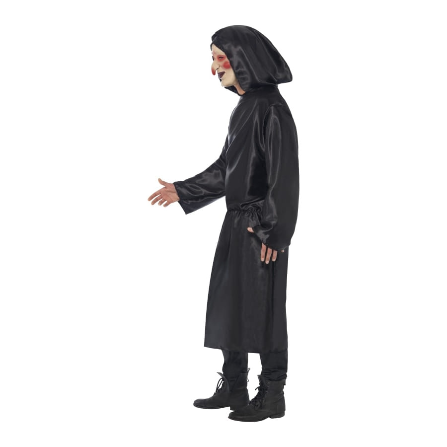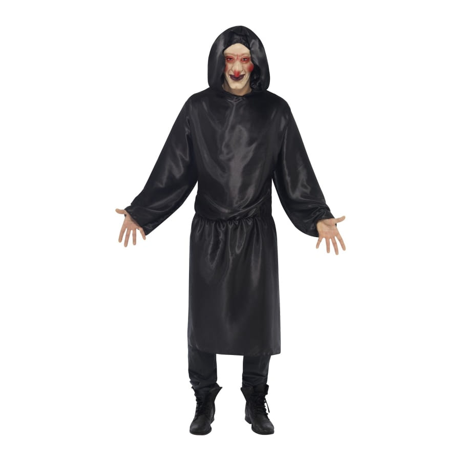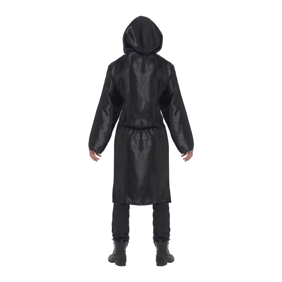Déguisement d'Halloween composé d'une longue robe noire, pour homme ou femme. Cette robe à capuche suffira à faire peur aux plus petits et à mettre mal à l'aise les plus grands! Tenez la hors de portée du feu.