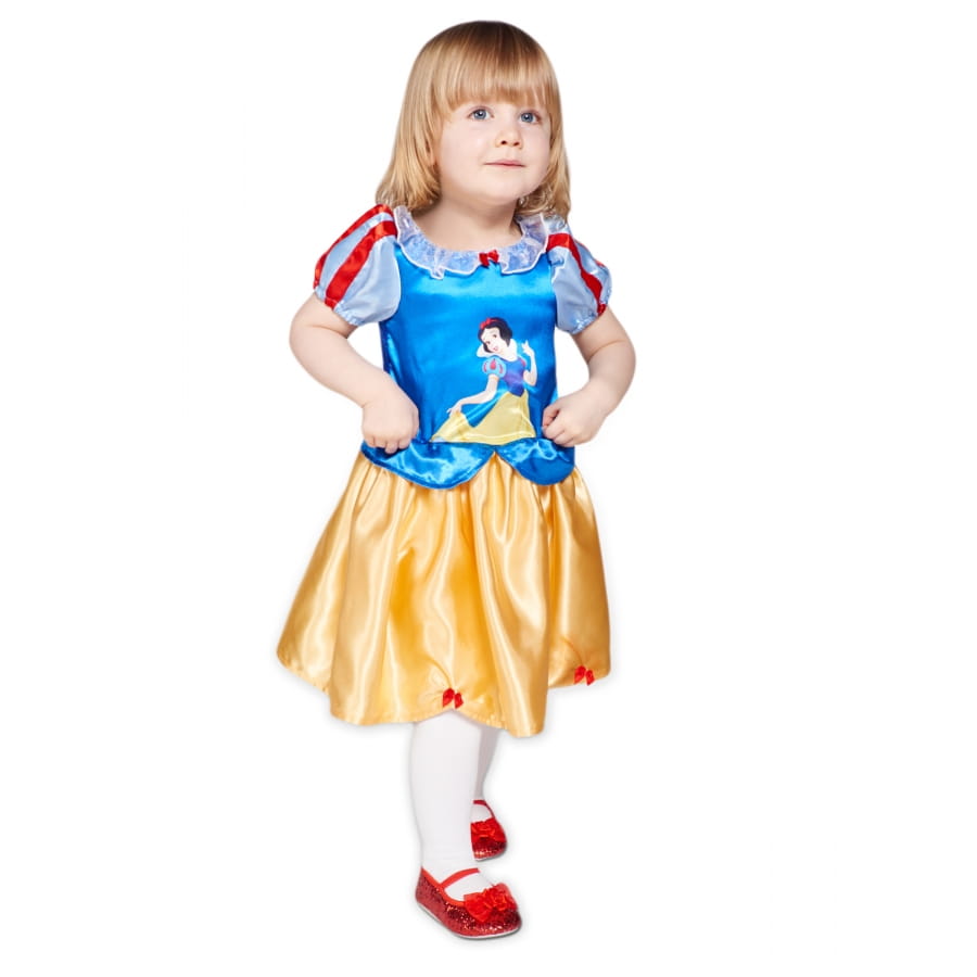 La robe de Blanche Neige pour bébé est cousue à partir d'un tissu satiné bicolore.