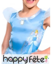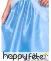 Cette robe sans manche est décorée de tulle au niveau des épaules et de chaque côté de la taille, ajoutant une touche de rêve et de légèreté à l'ensemble. Sur le buste, au niveau du cou, un dessin sous forme de camée représente la princesse Cendrillon, rappelant ainsi le thème du déguisement.