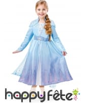 Le col de la robe est entouré d'une bande dans un coloris bleu argenté qui apporte une touche d'élégance et de féerie. Le bas de la robe est bleu satiné uni, donnant l'impression que votre enfant danse sur un nuage lorsqu'elle se déplace.