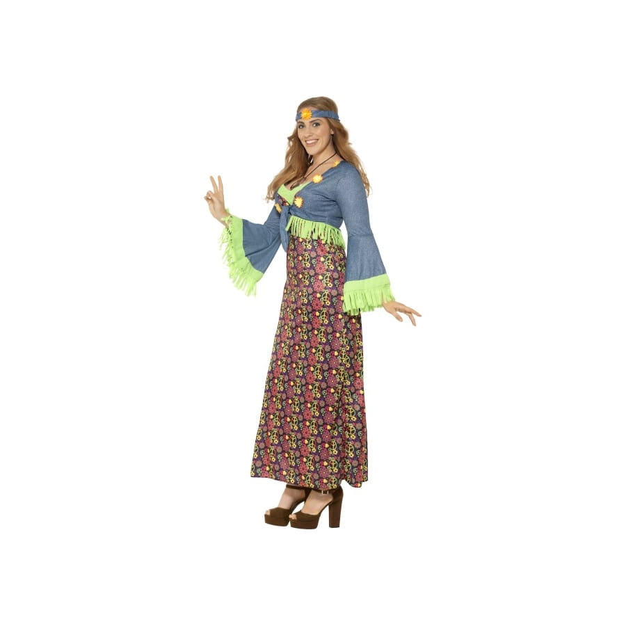 Jouez à la star hippie lors d'une soirée déguisée ! Reprendre le style vestimentaire des années 60 est un challenge intéressant, surtout pour la fête de la musique. Ce déguisement robe de hippie grande taille vous sera d'une grande aide. Il est composé d'une longue robe multicolore avec motifs fleurs et peace and love. Elle est accompagnée d'un petit gilet à franges, avec de longues manches. Ce fameux gilet associe les couleurs bleu et vert fluo. Un petit bandeau bleu orné d'une fleur orange est prévu pour les cheveux. Une paire de talons hauts est de rigueur pour compléter l'ensemble. Le site happyfete vous offre également une belle sélection de colliers peace and love en guise d'accessoire.