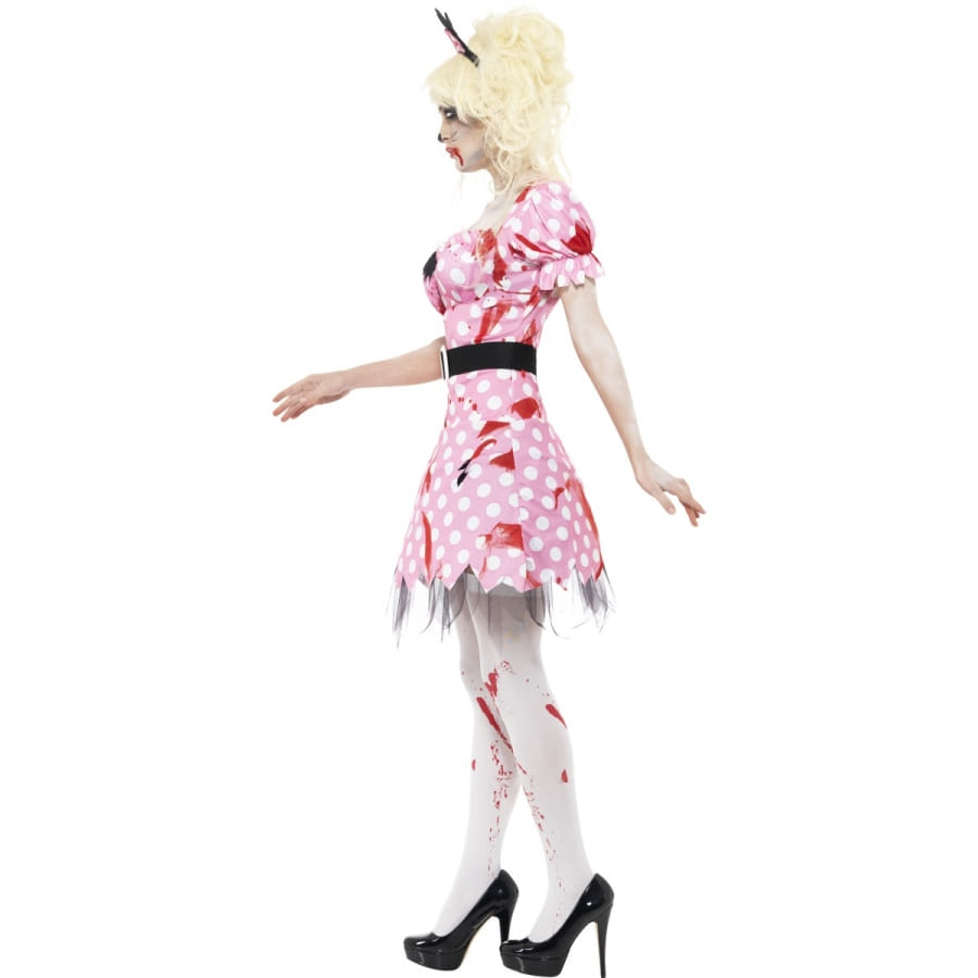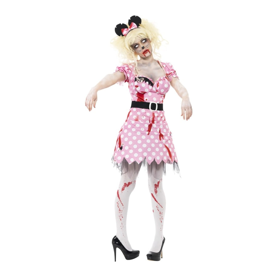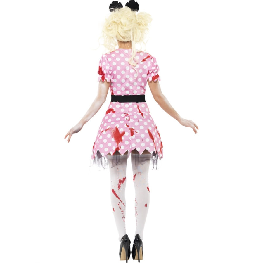 C'est une robe de Madame souris zombie qui est composé d'une robe de couleur rose à pois blancs, entaché de sang, avec une ceinture noire à boucle blanche et un serre-tête avec les oreilles de souris et son noeud rose à pois blanc.