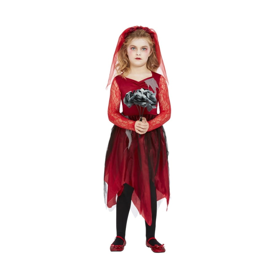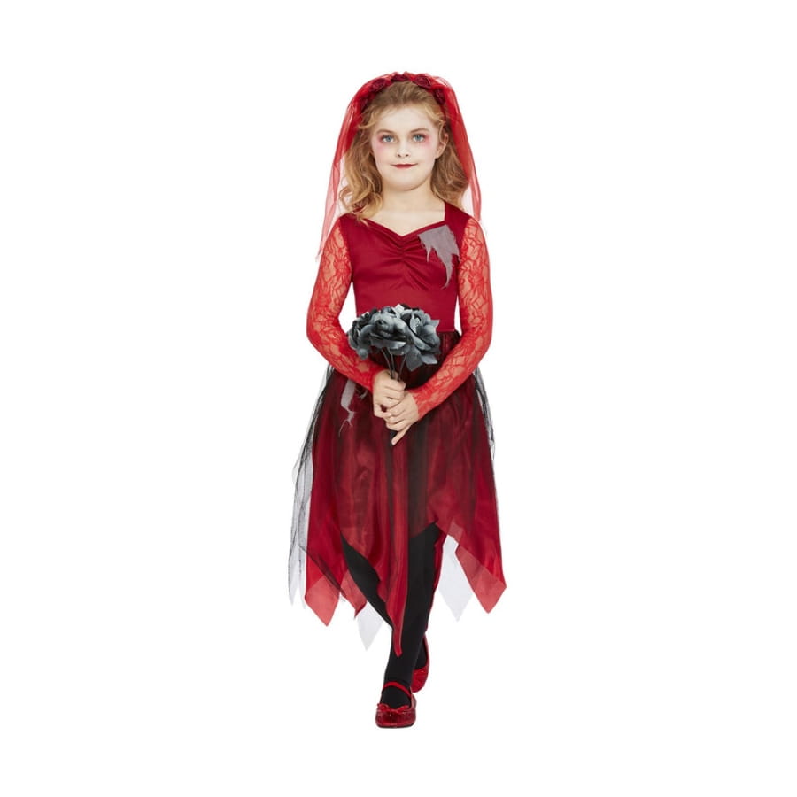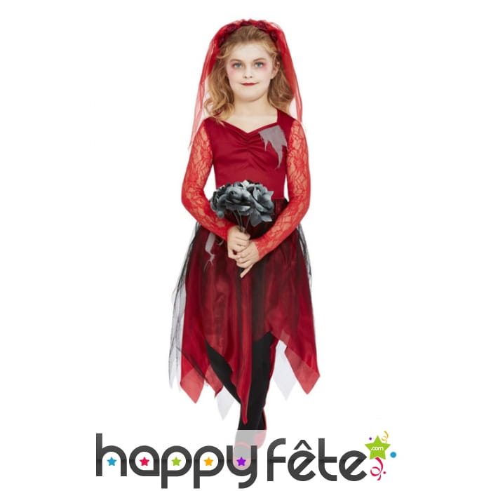 Un voile rouge transparent est fixé au serre-tête et complète le look de mariée terrifiante.
