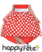 La robe est de couleur rouge, la couleur emblématique de Minnie Mouse. La partie basse de la robe est recouverte d'un fin voile rouge transparent à pois blancs, apportant une touche de légèreté et de fantaisie à la tenue. Le voile est asymétrique, étant plus long à l'arrière qu'à l'avant pour un effet de volume et de mouvement. La taille est marquée par une bande de tissu blanc qui entoure le corps, mettant en valeur la silhouette de votre enfant.