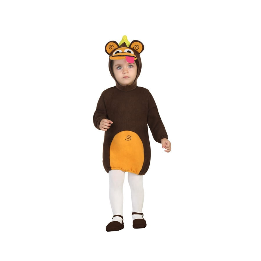 Cette robe de petit singe pour bébé avec coiffe a une couleur marron, à l'exception du ventre qui est de couleur jaune.