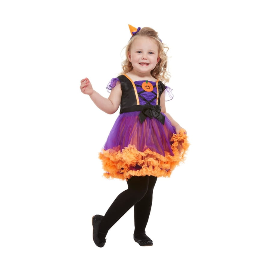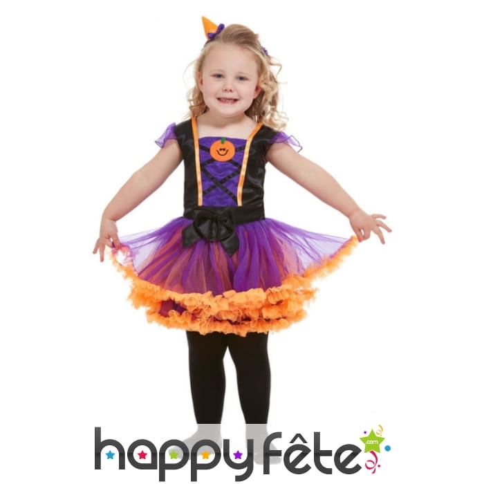 Cette robe de petite sorcière orange et violet sera parfaite pour transformer votre fille en une petite enchanteresse.