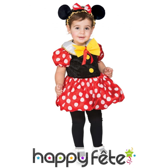 Assez courte notamment grâce à l'effet bouffant créé sur le bas, cette robe imite à merveille les couleurs traditionnelles de la tenue d'une souris célèbre avec du rouge à pois blancs et du noir agrémenté par du jaune et du blanc.