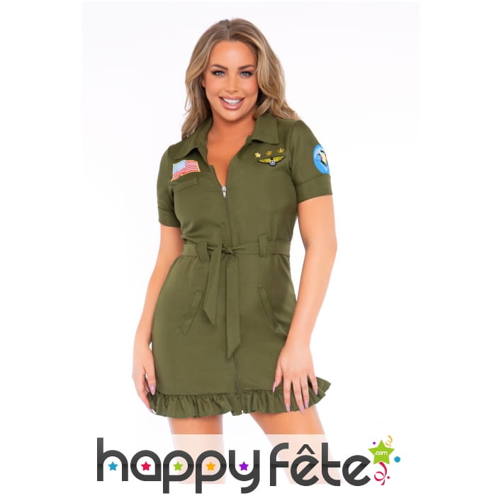 Sa couleur verte et ses imprimés (drapeau des Etats-Unis, symboles de l'aviation) inscrivent la tenue dans un univers militaire qui vous donnera l'allure d'un officier sexy.