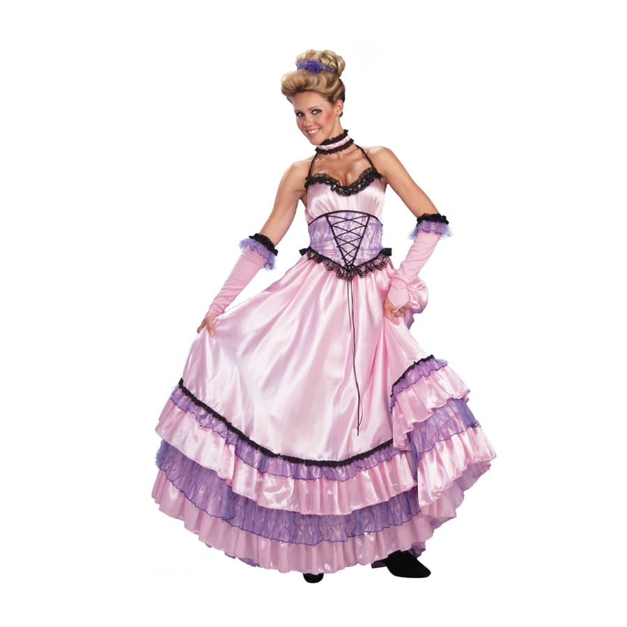 Soyez une véritable déesse avec ce costume de fille de saloon très original et très complet, une robe de saloon rose et violet, dédiée aux femmes ! Le déguisement se compose d'une longue robe rose, largement évasée, munie de plusieurs volants sur son bas et ornée de tissus en voile violet et noir. Cette robe est sans manches et décolletée. Son haut possède un corset à lacets noirs, qui peut jouer le rôle d'une ceinture, afin de permettre un ajustement parfait. Un tour de cou et une paire de mitaines longues, assortis à la robe, ainsi qu'une coiffe violette avec fleur fignolent à merveille l'ensemble. Pour une soirée à thème ou déguisée, optez pour ce splendide costume ! Vous ne passerez pas inaperçue et risquerez même de faire chavirer beaucoup de coeurs !