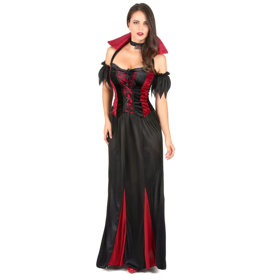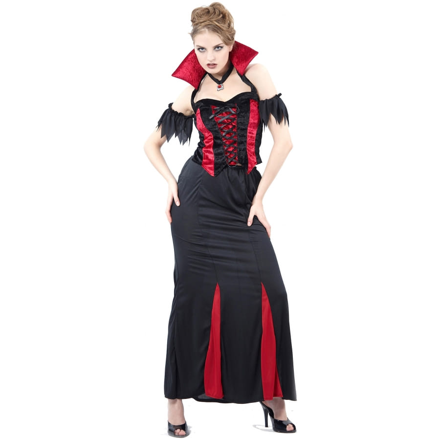 Il faut reconnaître que parmi tous les déguisements d'halloween, ceux des vampires ont une classe naturelle. C'est le cas de cette robe de vampiresse à grand col rouge pour femme que vous pouvez commander sur notre site. Elle est formée d'un bustier rouge et noir, décorée par un corsage sur le devant. A ce bustier se trouve rattaché un col montant de couleur rouge, ainsi que deux brassards. Le costume s'accompagne aussi d'un collier à strass maintenu par un ruban noir. La tenue comprend aussi une longue jupe noire, avec une touche de rouge au niveau des fausses fentes. Elle est pourvue d'un élastique à la taille pour offrir un confort et un meilleur ajustement.