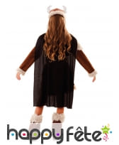 Une coiffe marron à fausse fourrure grise et à cornes blanches accompagnent la tenue, tandis que des couvre-bottes marron surmontés d'une fausse fourrure grise en apportent la touche finale.
