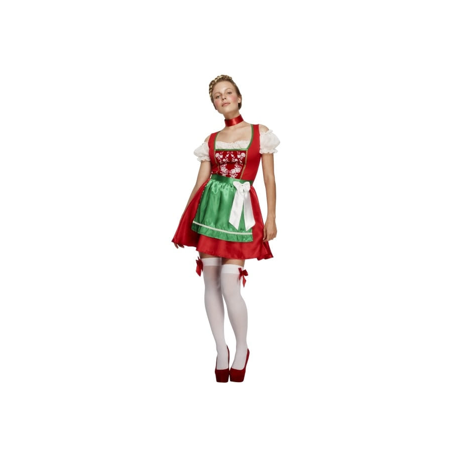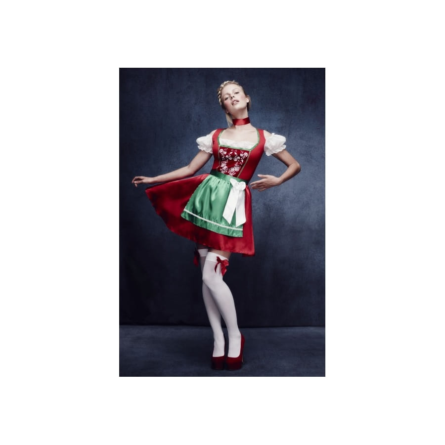 Il est toujours très tentant de mettre les tenues traditionnelles pour une fête déguisée, surtout les tenues bavaroises comme ce costume Dirndl de Noël pour femme que nous vous présentons ici. Pour mettre à l'honneur les Dirndl, nous avons cette robe de couleur blanche et rouge pour le haut, et entièrement rouge pour la jupe, avec un tablier de couleur verte muni d'un noeud blanc attaché à la jupe. Il y a également un jupon attaché à cette robe. Les tailles que nous vous proposons, Mesdames, pour ce déguisement sont : L, M et S. Coiffez-vous avec des nattes pour beaucoup plus d'effet et pour que cette belle culture soit bien représentée.
