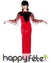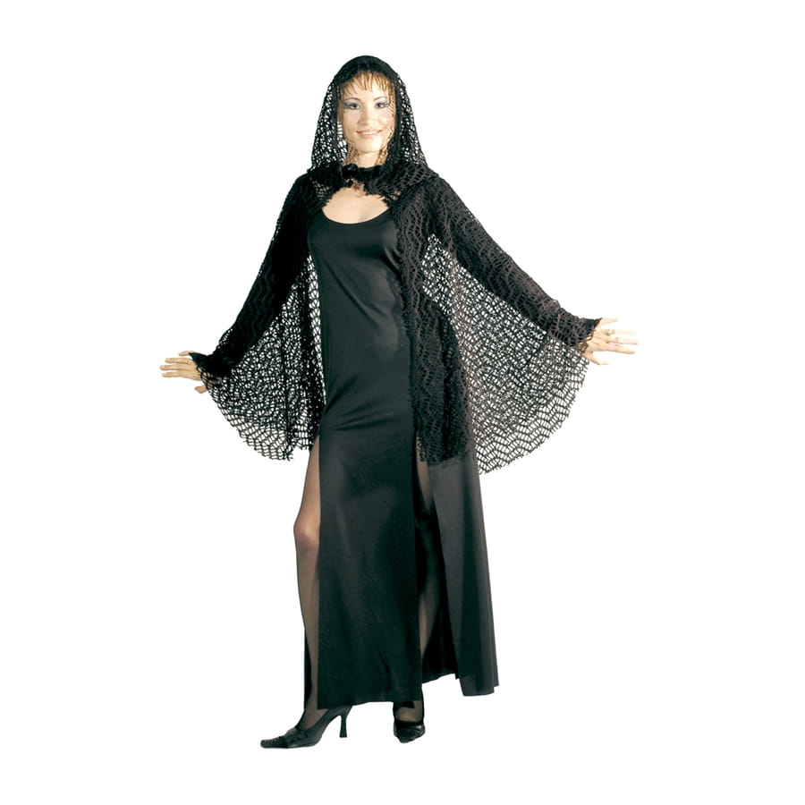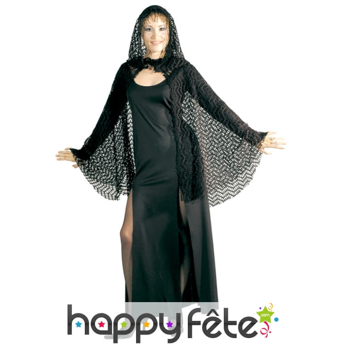 Robe noire dans le style robe de soirée avec une fente de chaque côté. Cet ensemble est donc composé de la robe ainsi que de la cape dans le style toile d’araignée ( sorte de dentelle ). Ce déguisement convient parfaitement à une soirée Halloween sur le thème chic et élégant. Pour accessoiriser le costume nous vous conseillons de porter des chaussures à talons ainsi que des collants ou des bas noires.