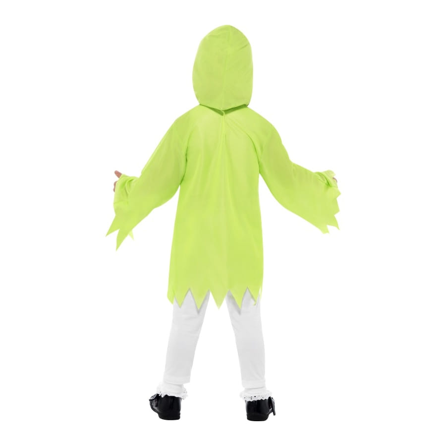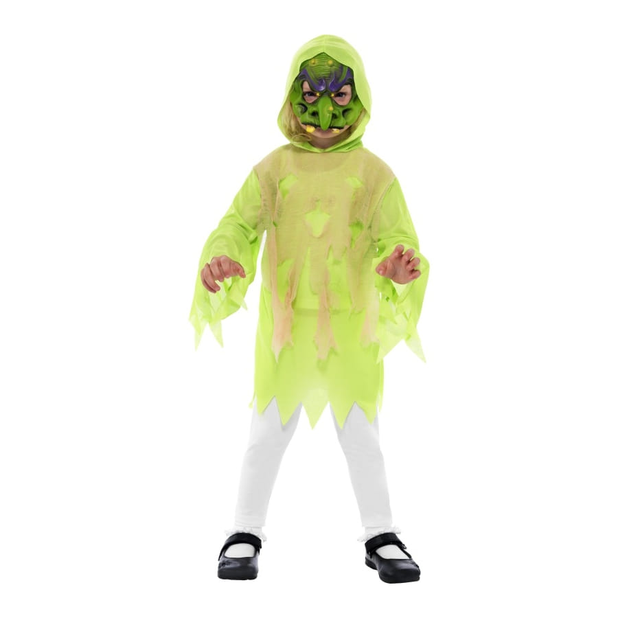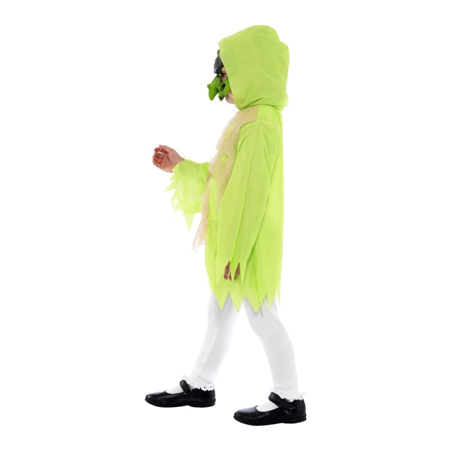 Déguisement de sorcière pour enfant, composé d'une robe vert pâle et d'un masque vert. Cet ensemble fera de votre enfant une véritable sorcière comme on en voit dans les contes de fées. Idéal pour Halloween.