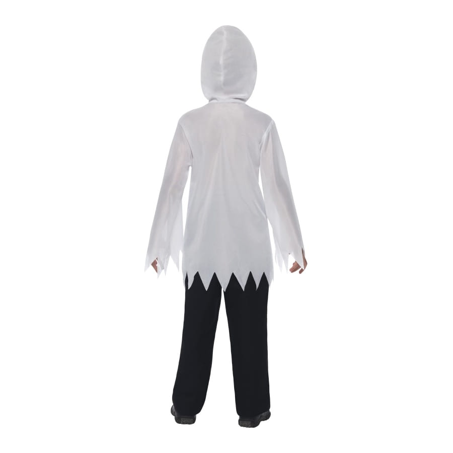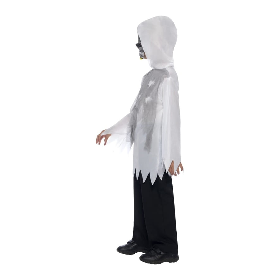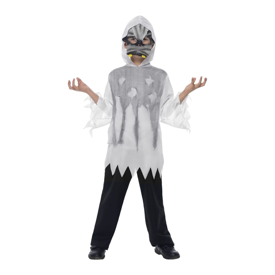 Déguisement de squelette, pour garçon, composé d'une robe grise et blanche, et d'un masque noir, gris et blanc. Cet ensemble donnera un air effrayant à votre enfant tout en dissimulant son identité, lui permettant de faire peur à tous ses proches pour Halloween.