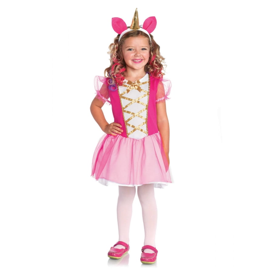 Transformez votre fillette en petite licorne rose le temps d'une soirée sur le thème Conte de fée, grâce à la Robe et oreilles avec corne de petite licorne rose.