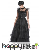 Plongeons-nous d'abord dans le coeur de ce costume : la longue robe à volants noirs. Avec un effet velours qui crie sophistication, ces volants ajoutent une dimension dramatique, donnant un volume incroyable à la robe. Imaginez-vous, tournoyant sur la piste de danse, chaque mouvement amplifié par cet effet en toile. Magnifique, non ? Et ce n'est pas tout. Le haut avec son col en dentelle évoque la délicatesse d'une époque révolue, tandis que les manches transparentes et mi-longues ajoutent une touche moderne. Pas de prise de tête pour la mettre : la fermeture zippée au dos est là pour vous faciliter la vie.