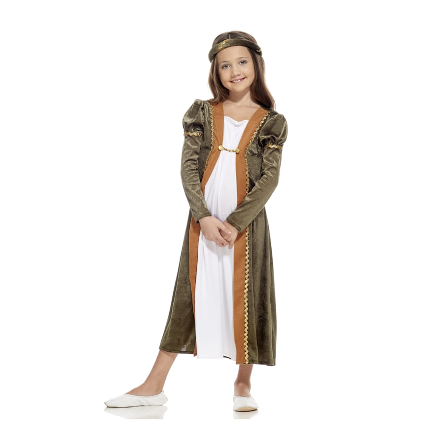 Il est également conseillé de partager la passion de l'histoire aux enfants, et les déguiser en personnages des anciens temps peut y contribuer. Cette robe médiévale effet velours de petite princesse replongera votre fillette dans le Moyen-Age. La robe est simple mais très classe. Elle est de couleur blanche sur le milieu, et les deux côtés, incluant les manches, sont faits de velours de couleur verte, bordé d'un tissu orange. Les manches sont longues, légèrement bouffantes au niveau des épaules. La robe en elle-même est longue, allant jusqu'au-dessus des chevilles. Si votre fille a de longs cheveux, vous pourrez la coiffer à l'ancienne, sinon venez choisir une perruque parmi notre large gamme de produits.