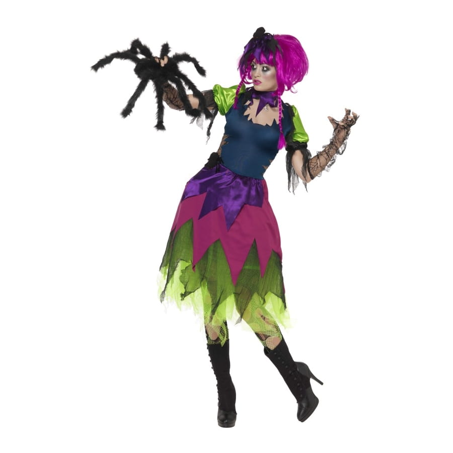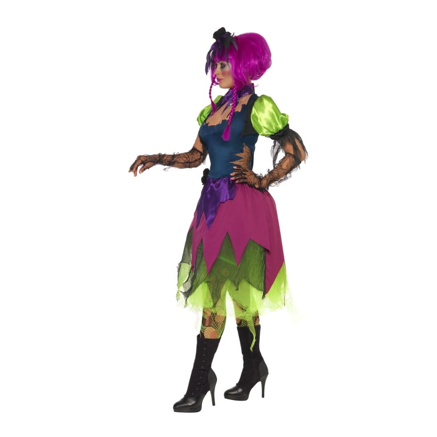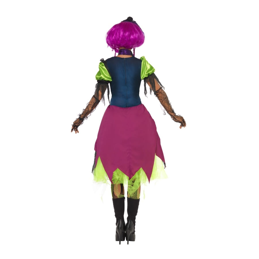 Set de Miss Halloween, pour femme, composé d'une robe, d'un collier et d'un serre-tête (petit chapeau). La robe est de couleur verte, bleu, violette et noire. Le chapeau et le collier sont tous deux noirs. Cette robe possède un côté excentrique, gothique et punk à la fois. Le set entier sera parfait pour Halloween.