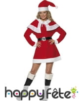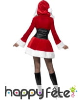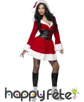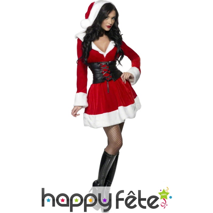 Costume de Miss Santa sexy pour femme. Cet ensemble est composé d'une robe rouge avec bordures blanches, d'un bonnet assorti avec pompom blanc et d'une ceinture en forme de corset de couleur noire. Le tout est disponible en taille S, M ou L. Tout le monde n'aura d'yeux que pour vous et votre sublime tenue!